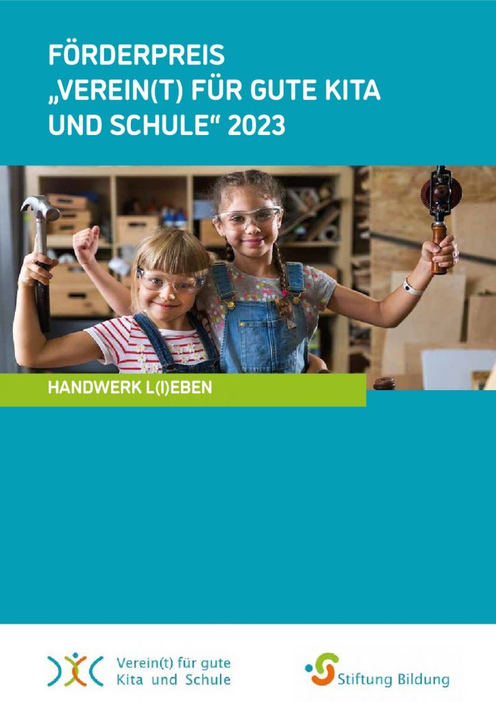 Hier könnt ihr euch die neue Förderpreisbroschüre „Verein(t) für gute Kita und Schule 2023“ zum Thema „Handwerk l(i)eben“ herunterladen. In der 44-seitigen Broschüre stellen wir konkrete Handwerksprojekte aus Kindergärten und Schulen vor, die zeigen, was Bildung sein kann: praxisnah, zukunftsorientiert, individuelle Talente fördernd und partizipativ.